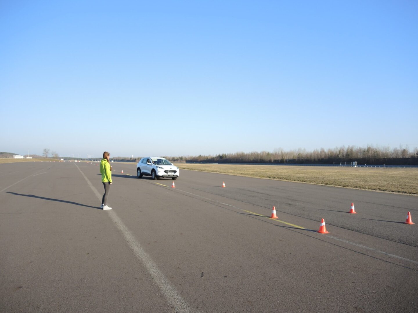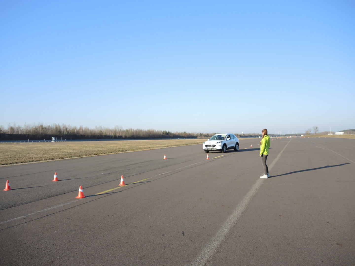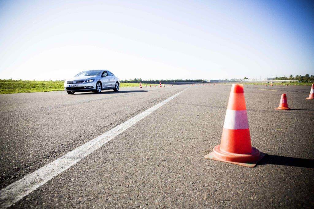 Hier trainieren die Teilnehmerinnen das sichere Beherrschen von Lenk- und Ausweichübungen. Gefährliche Situationen im Straßenverkehr können so simuliert werden und von den Fahrerinnen frühzeitig erkannt und kontrolliert werden.